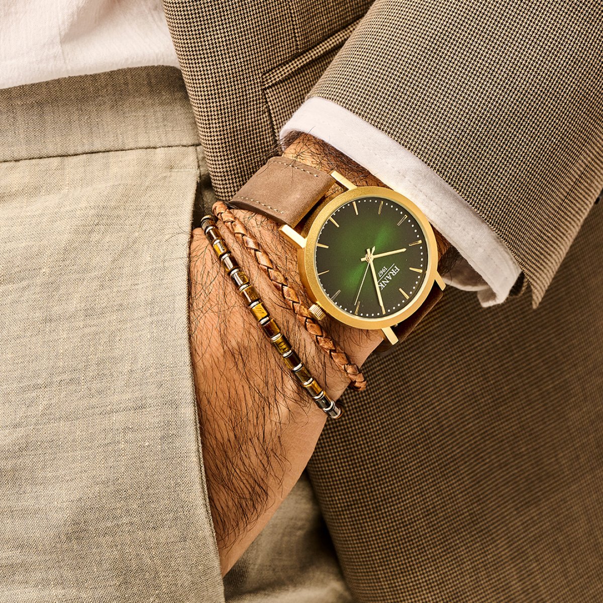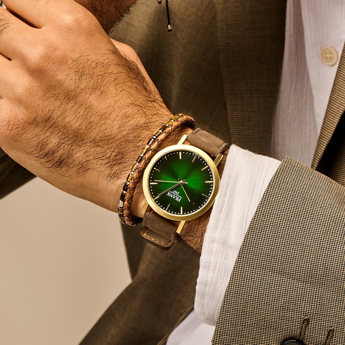 Pánske analógové hodinky FRANK 1967 majú 42 mm široké puzdro vyrobené z prémiových materiálov. Jeho ciferník obsahuje lesklé pruhy označujúce hodiny a minúty, zatiaľ čo zelený ciferník spojený s tmavohnedým koženým remienkom dodáva hodinkám moderný estetický vzhľad. Remienok z pravej kože sa pýši matným povrchom, meria 25,5 cm na dĺžku a 2 cm na šírku, je zaistený zapínaním na pracku. Vďaka vodotesnosti 5 ATM zaručujú tieto hodinky odolnosť a všestrannosť. Či už uprednostňujete klasický vzhľad alebo hľadáte moderný akcent, tieto hodinky bez problémov doplnia akýkoľvek osobný štýl.