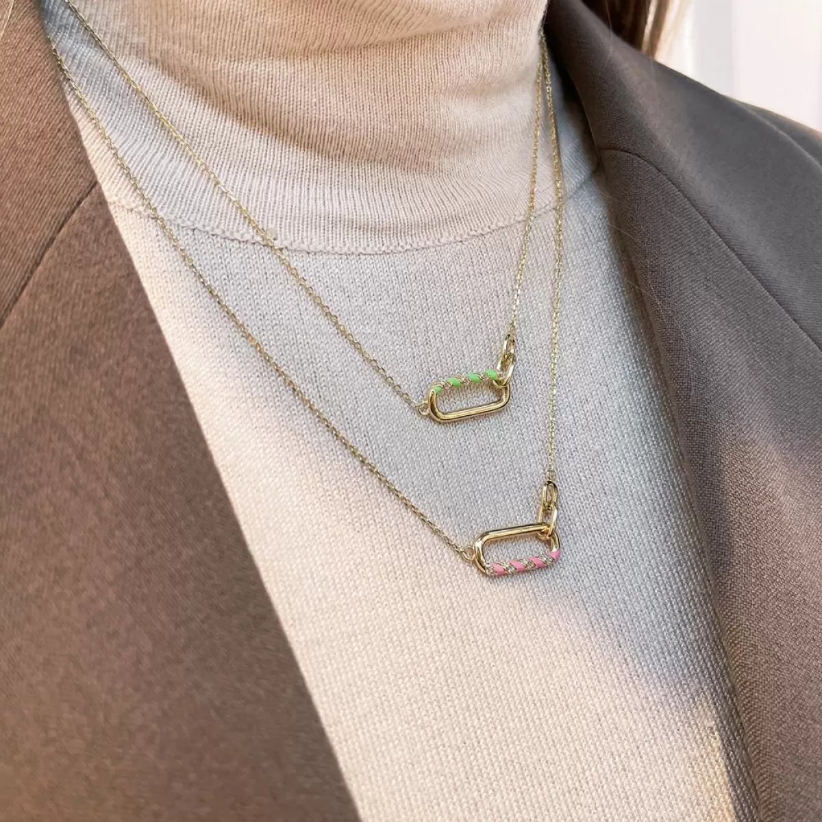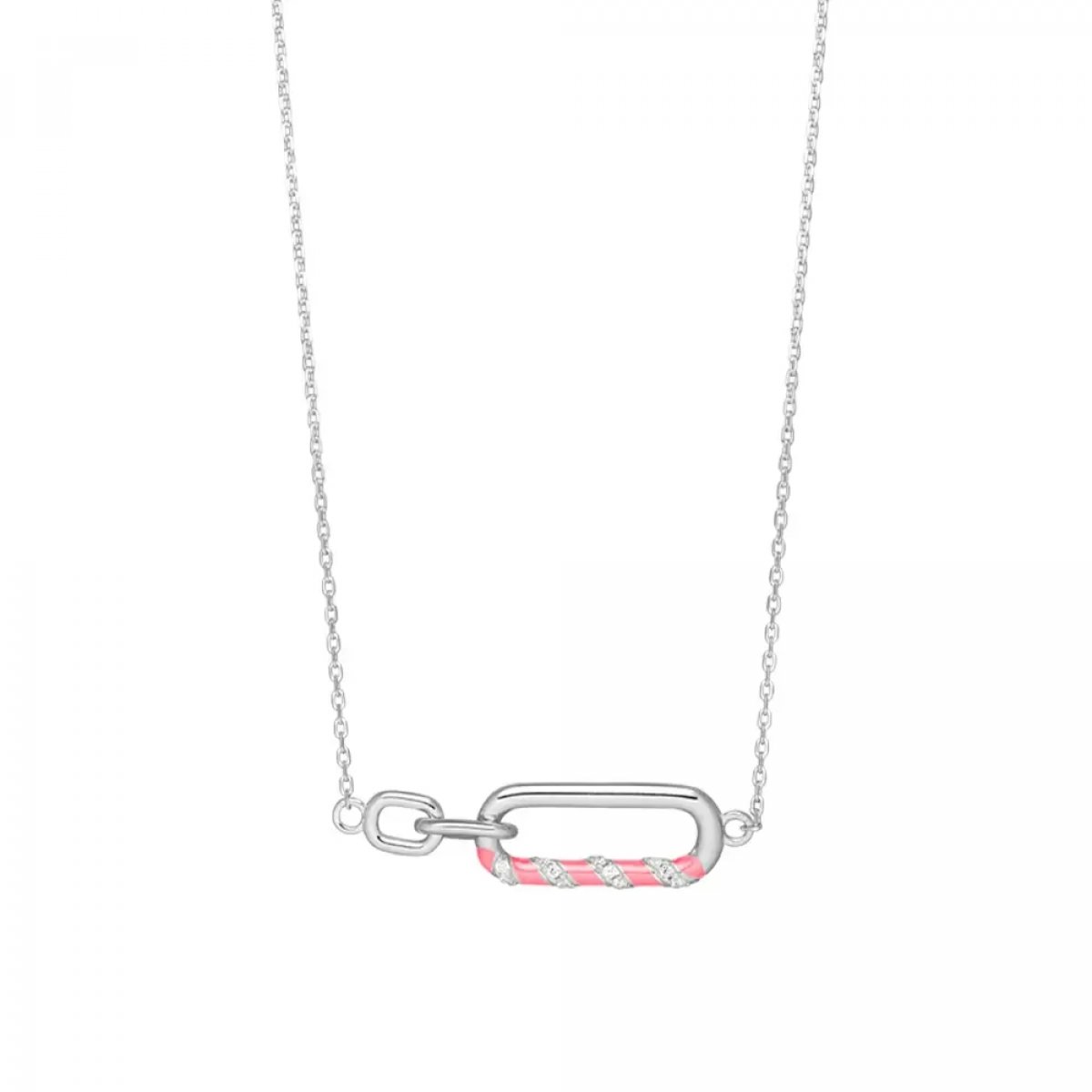 Dámsky náhrdelník LEAF bol ručne vyrobený z jemného striebra 925 a je módnou nevyhnutnosťou pre každú šperkovnicu. Krátku striebornú retiazku zdobí hravý prívesok pozostávajúci z niekoľkých článkov. Ako pozornosť retiazka vyniká neónovo ružovou smaltovanou farbou a do nej zakomponovanými zirkónovými kamienkami. .