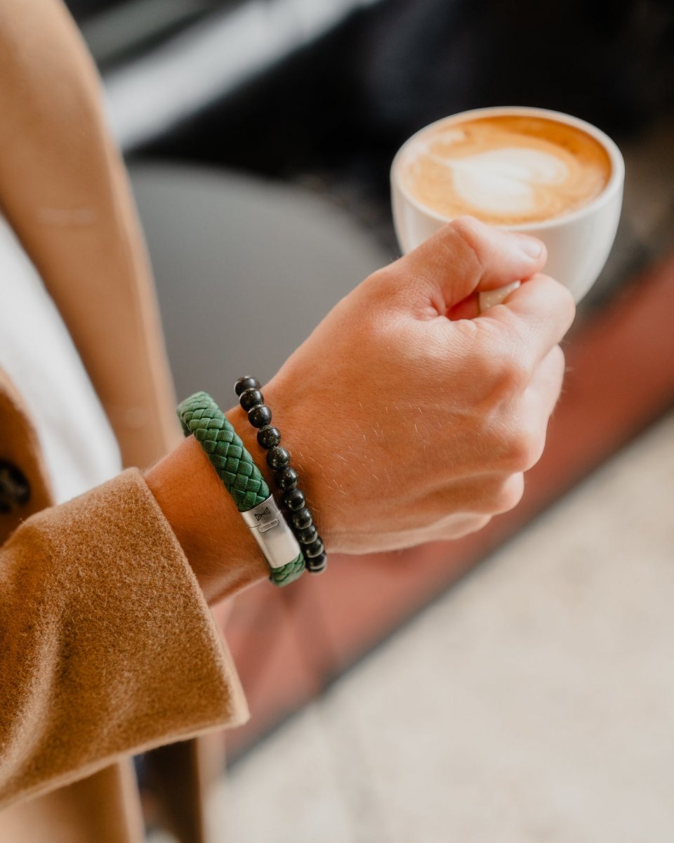 Štýlový a nadčasový náramok AZE sa perfektne hodí pre každého a dodá vašej osobnosti okamžitý štýl. Vyrobené z vysoko kvalitnej zelenej kože s oceľovým brúseným zámkom. Tento náramok sa dá skvele kombinovať s ostatnými šperkami Aze. Dĺžka náramku je 21 cm.