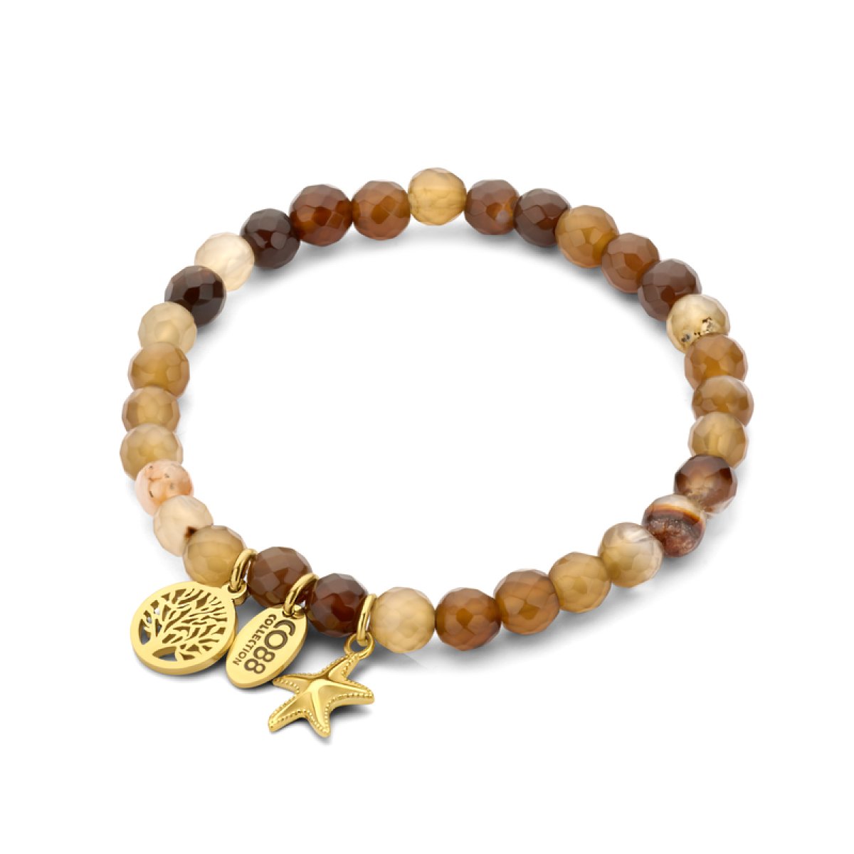 Korálkový náramok CO88 zdobený achátom a pozlátenými príveskami z nehrdzavejúcej ocele. Dĺžka náramku je 18 cm. Veľkosť príveskov cca 1 cm, veľkosť kameňov cca 0,6 cm.