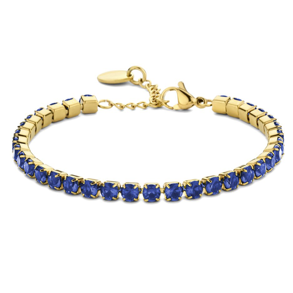 Dámsky náramok CO88 vyrobený z kvalitnej ocele, pozlátený žltým zlatom, zdobený modrými zirkónmi. Dĺžka náramku je 16,5 cm s možnosťou predĺženia o 3 cm. Veľkosť kameňov je 0,4 cm.