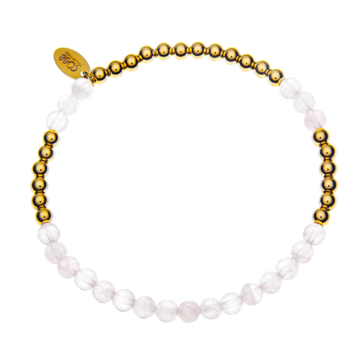 Dámsky korálkový náramok CO88 s ruženínom a pozlátenými oceľovými guličkami. Veľkosť kameňa 0,4 cm. Dĺžka náramku je cca 17 cm.