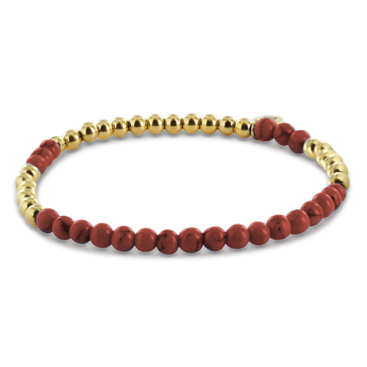 Dámsky korálkový náramok CO88 s jaspisom a pozlátenými oceľovými guličkami. Veľkosť kameňa 0,4 cm. Dĺžka náramku je cca 17 cm.