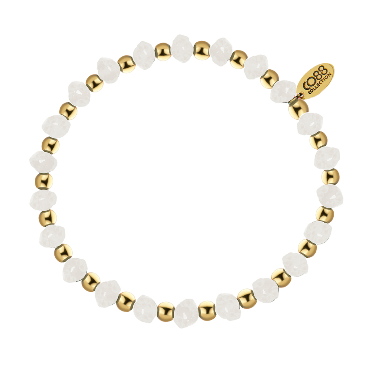 Dámsky korálkový náramok CO88 s perlami a pozlátenými oceľovými guličkami. Veľkosť kameňa 0,4 cm. Dĺžka náramku je cca 18 cm.