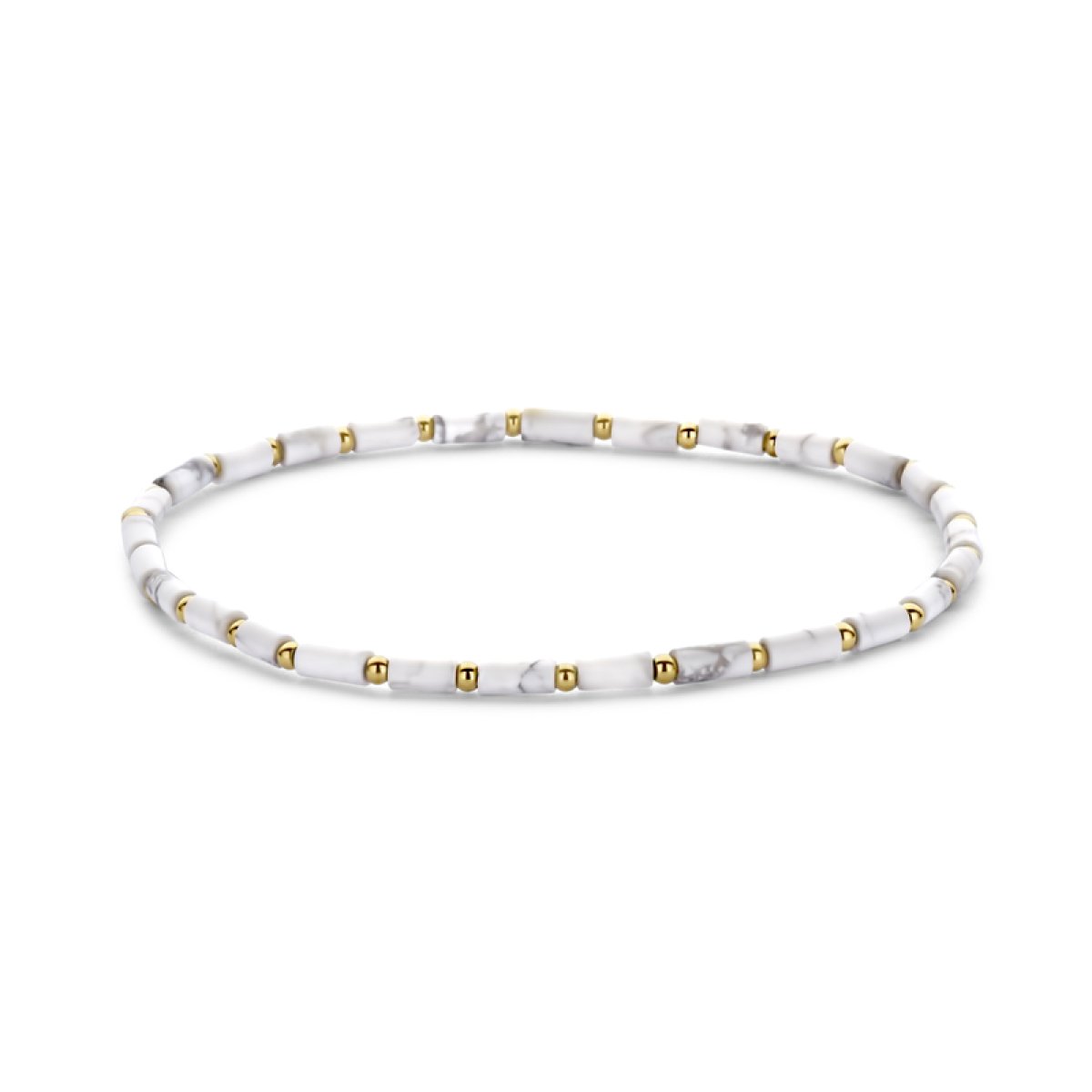 Oceľový náramok CO88 s bielymi korálkami Howlit a pozlátenou oceľou. Dĺžka náramku je 18 cm. Veľkosť korálok: 0,4 x 0,2 cm.