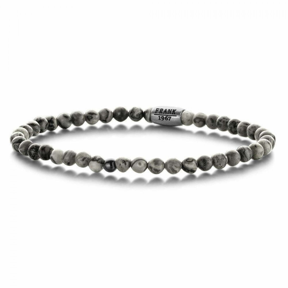 Pánsky elastický 20 cm náramok FRANK 1967 zdobený jemnými 4 mm korálkami z prírodného kameňa šedý Jaspis a Hematit s uzáverom z nehrdzavejúcej ocele. Jeho veľkosť a neutrálne sfarbenie ho predurčujú na zladenie s inými náramkami.