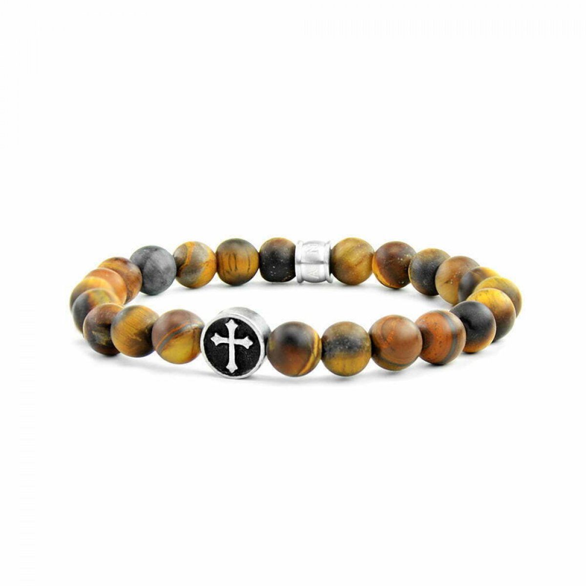 Pánsky náramok FRANK 1967 s korálkami Tigrie oko 8 mm a krížikom z nehrdzavejúcej ocele. Ideálne v kombinácii s inými náramkami pre vrstvený vzhľad.