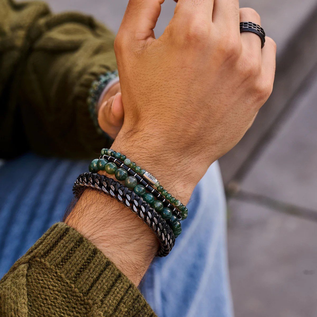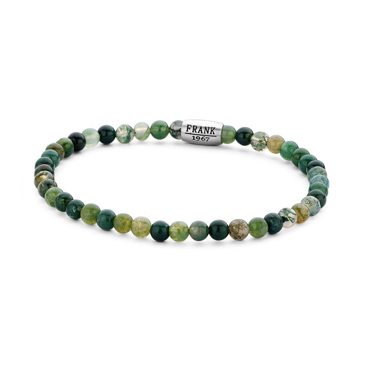Pánsky náramok FRANK 1967 s korálkami z machového achátu s priemerom 4 mm a jedinečným hematitovým korálkom stelesňuje sofistikovanosť. S vnútornou veľkosťou 18,5 cm sľubuje prispôsobený strih pre sofistikovanosť bez námahy. Pozdvihnite svoj image pomocou tohto skvelého doplnku.