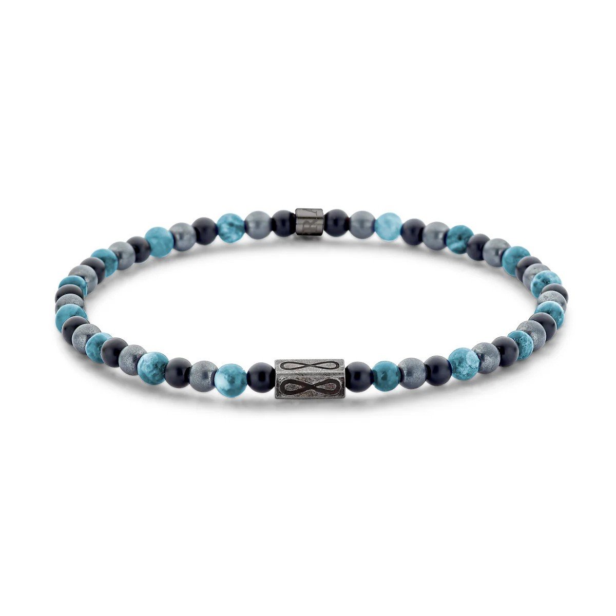 Vstúpte do nadčasovej elegancie s náramkom FRANK 1967 s korálkou nekonečna; majstrovské dielo spájajúce sofistikovanosť s drsným šarmom. Nekonečný oceľový prvok, ktorý pridáva moderný okraj, zdobí prednú časť, ktorá symbolizuje večný štýl a odolnosť. Táto infúzia industriálneho dizajnu s prírodnými prvkami ( modrý apatit, šedý hematit, čierny achát) vyvoláva pocit sofistikovanosti a individuality. Náramok má prírodné korálky, každý má priemer 4 mm a celkovú dĺžku 18,5 cm.
