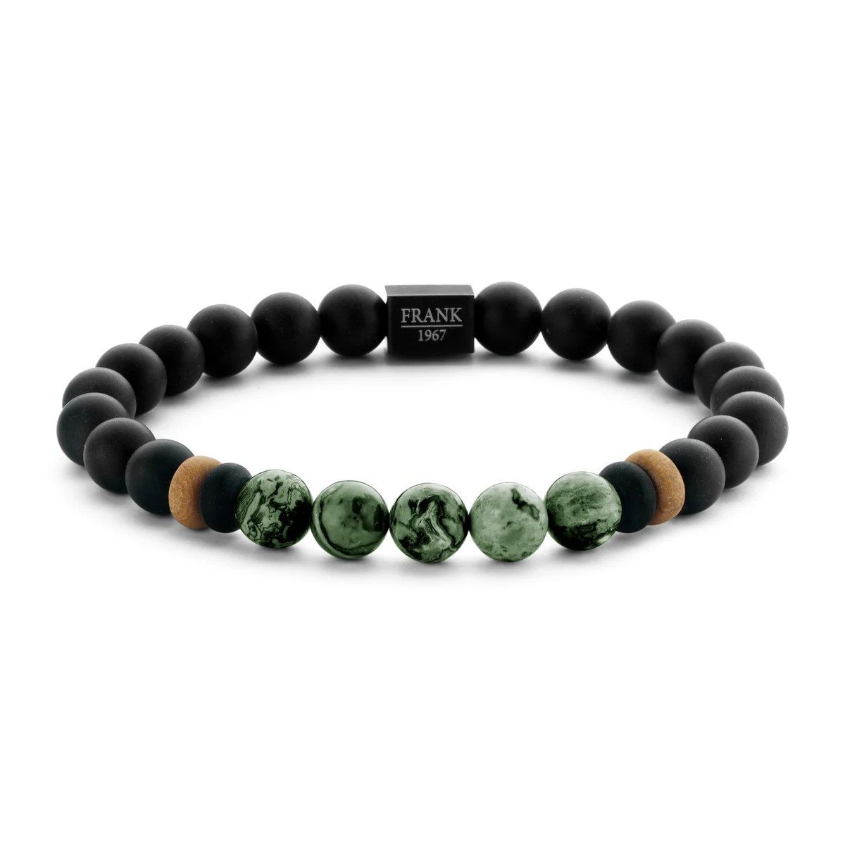 Pánsky naťahovací náramok FRANK 1967 s 8 mm korálkami z prírodného matného čierneho achátu a zeleného jaspisu. Ideálne v kombinácii s inými náramkami pre vrstvený vzhľad. Veľkosť náramku je 21 cm. Tento náramok nie je len doplnkom, ale dodáva každému vzhľadu charakter a sebavedomie.