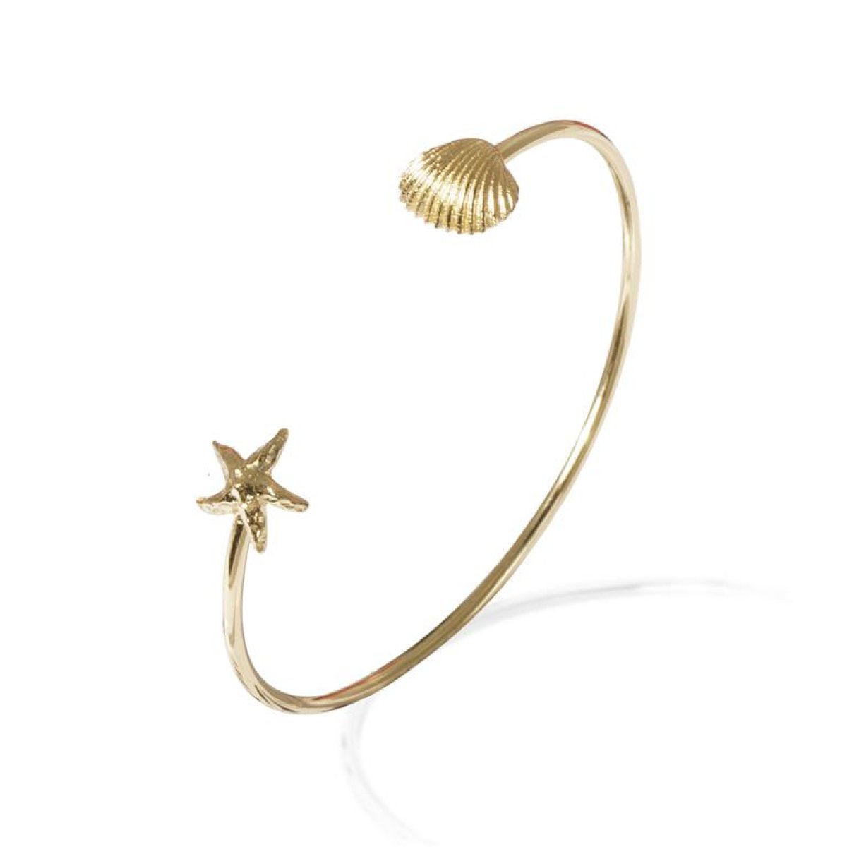 Pevný náramok MISIS vyrobený zo striebra, pozlátený 18K zlatom, zdobený mušľou a hviezdicou. Veľkosť náramku je cca 6 x 5 cm, veľkosť príveskov cca 1 cm.