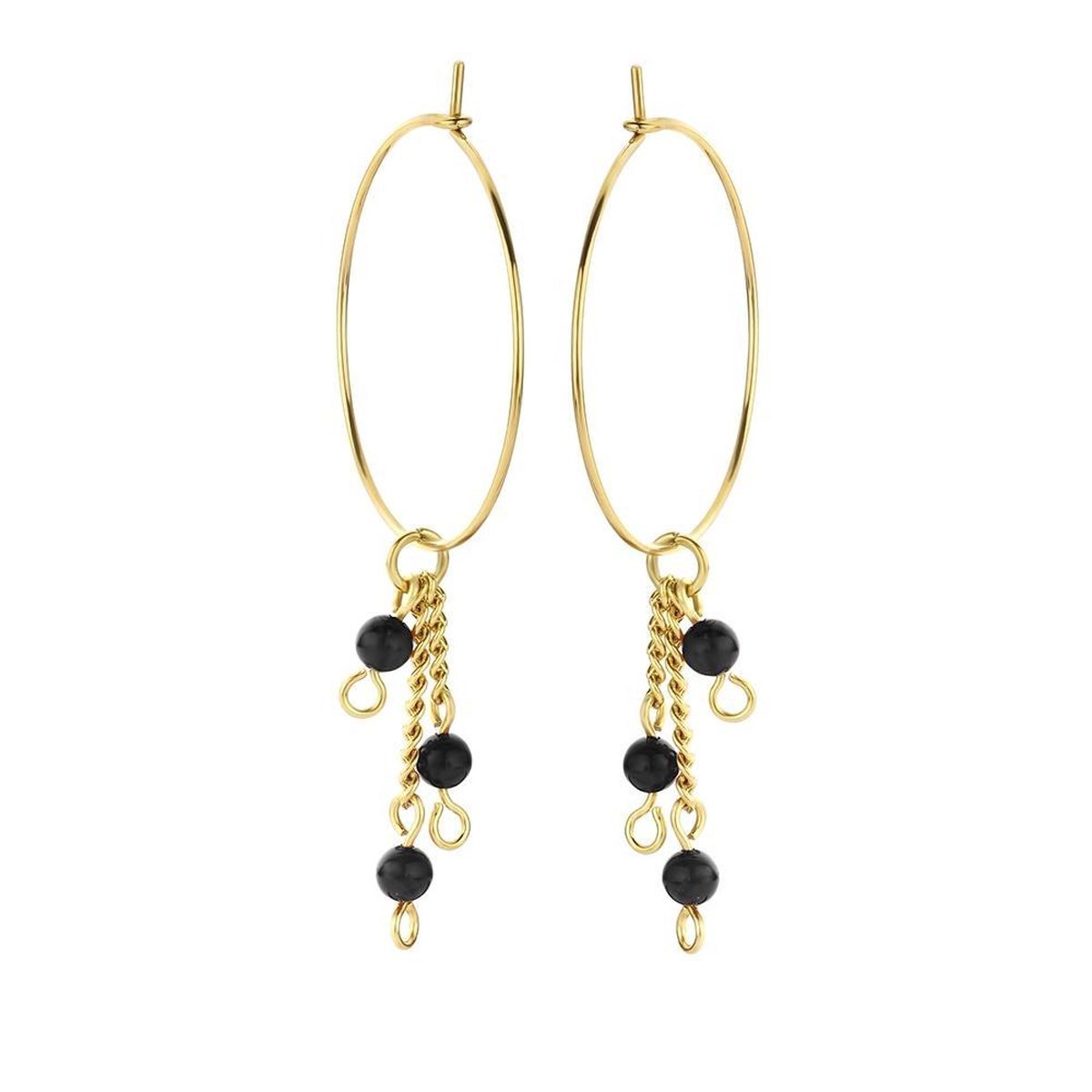 Dámske náušnice CO88 vyrobené z kvalitnej ocele, pozlátené žltým zlatom, zdobené čiernym achátom. Priemer náušnice je 2,5 cm, veľkosť korálky cca 0,3 cm.