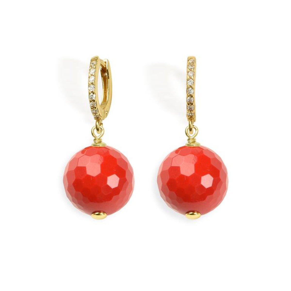 Náušnice MISIS vyrobené z ródiovaného striebra, pozlátené 18k zlatom, krásne zdobené zirkónmi a červenou koralovou pastou. Priemer kruhu je 1,4 cm, achát 1,4 cm.