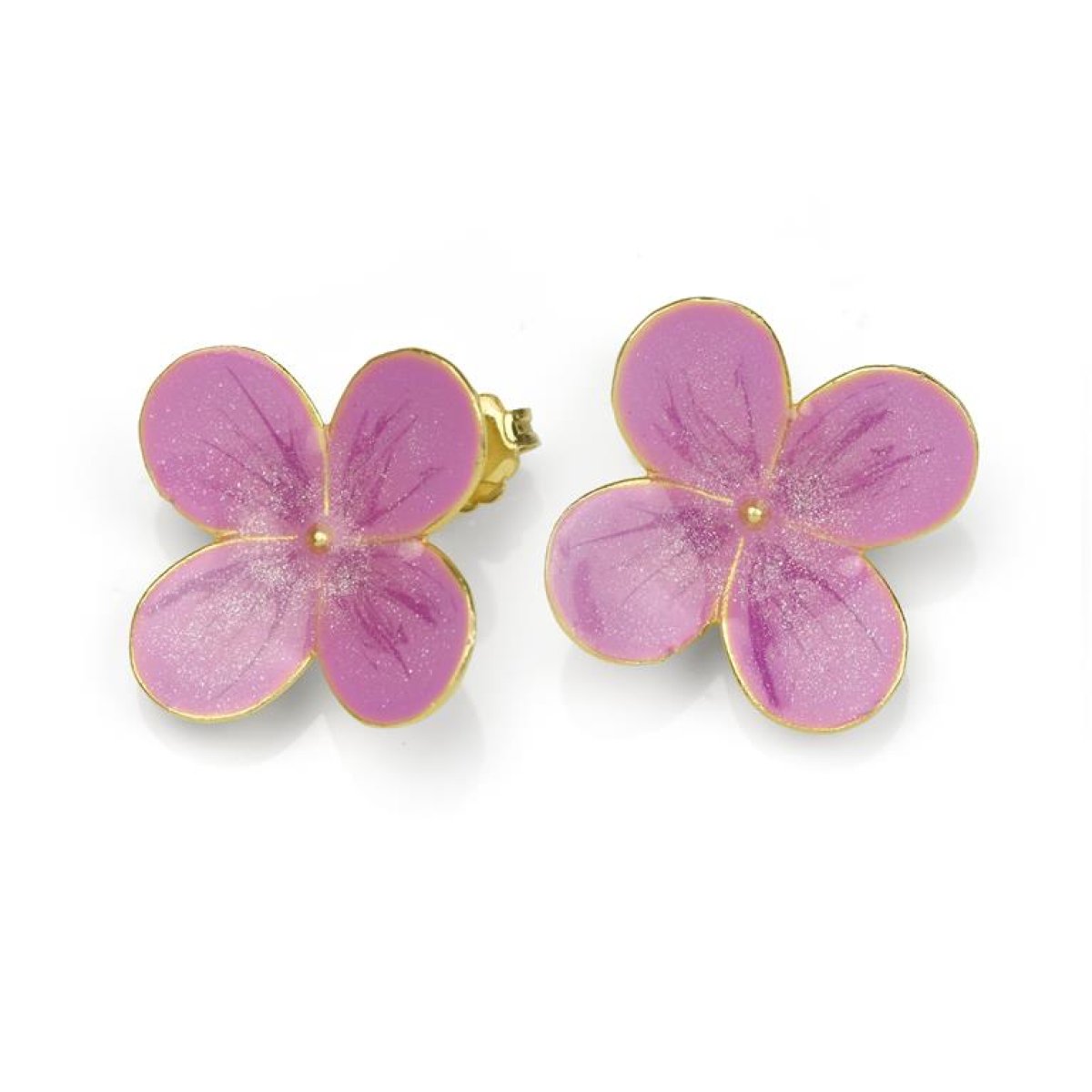 Náušnice MISIS vyrobené z 18kt pozláteného striebra 925, zdobené kvetinovým príveskom s fialovým smaltom. Veľkosť náušníc je cca 1,5 cm.