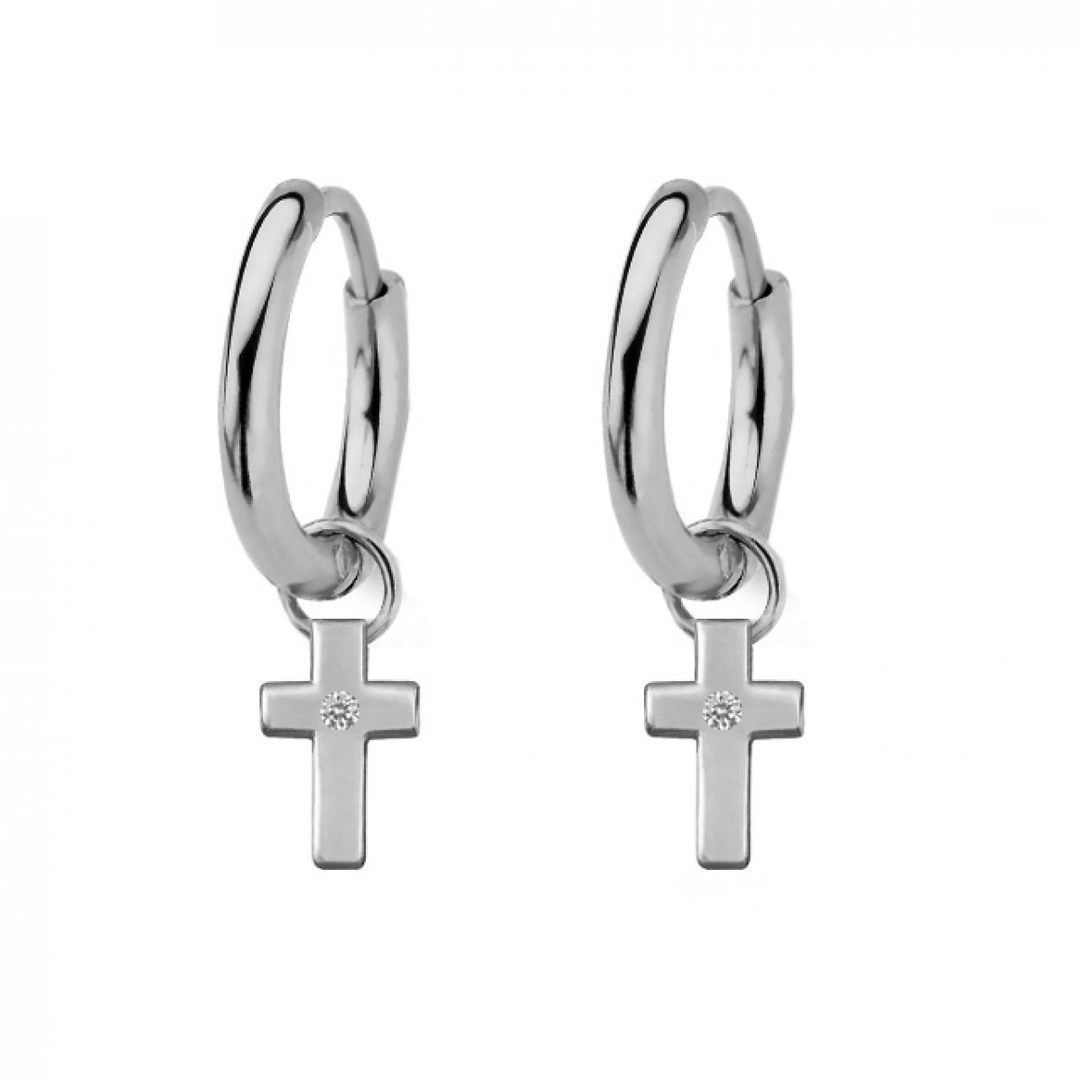 Kruhové náušnice NEW BLING vyrobené zo striebra, zdobené príveskom v tvare krížika. Priemer kruhu je 1,2 cm a veľkosť krížika 0,5 x 1 cm.