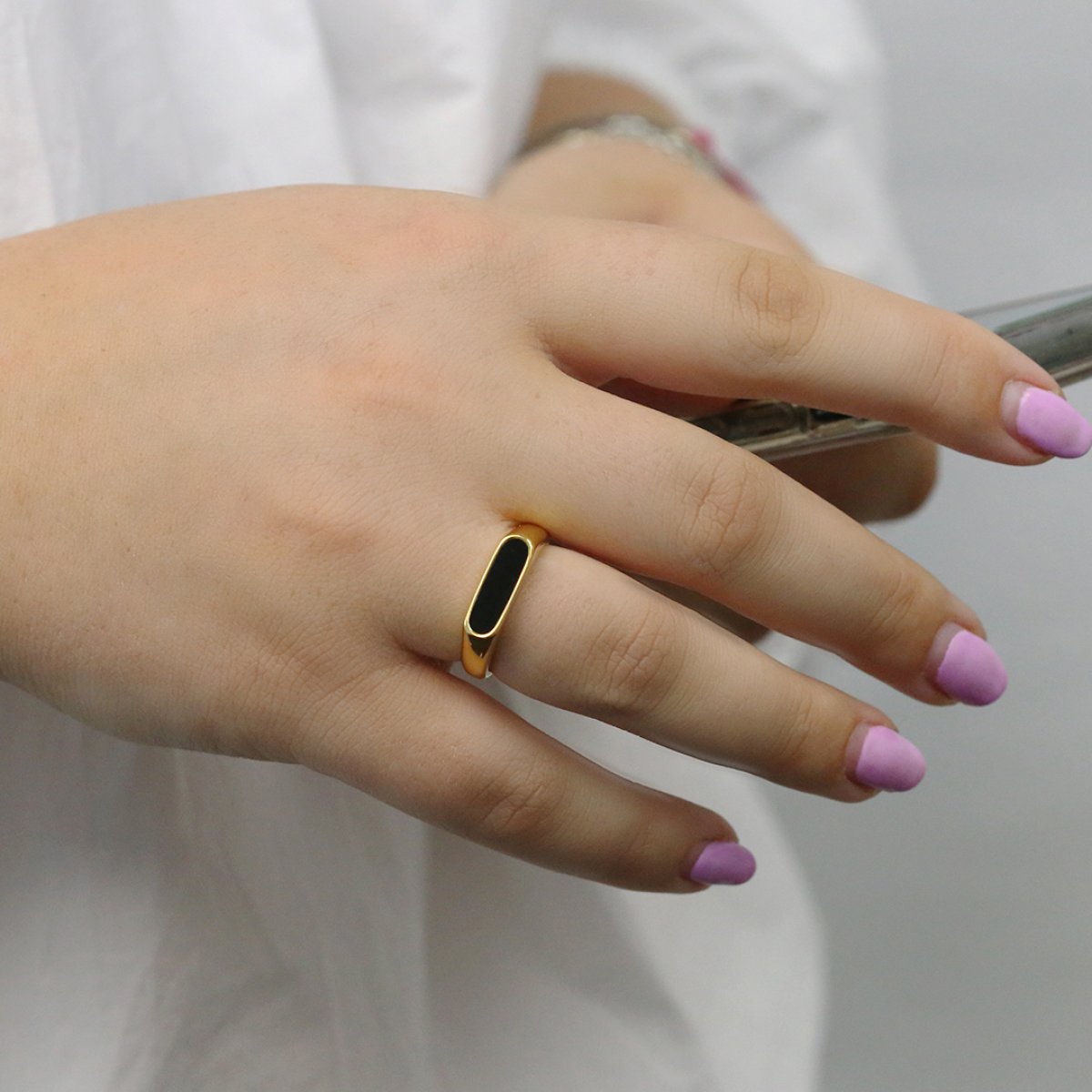 Dámsky prsteň CO88 predstavuje podmanivé spojenie elegancie so širokým pásom zdobeným čiernym emailom. Tento prsteň má 5,5 mm široký remienok a je vyrobený z nehrdzavejúcej ocele, pozlátenej žltým zlatom.